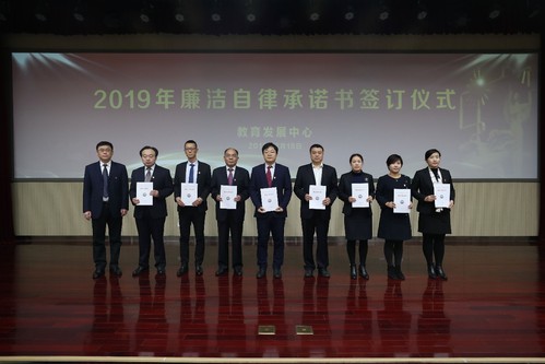 3月18日下午,教育发展中心党委在新学期工作会上举行2019年廉洁自律承诺书签订仪式,28个部门负责人在承诺书上签字。党委书记马国刚主持签订仪式,中心全体员工参加活动。