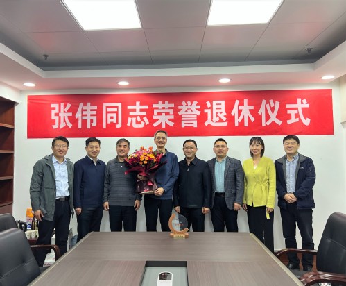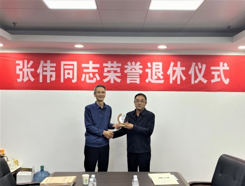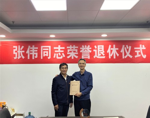 吴强明为张伟同志颁发荣休纪念奖牌,张卫东代表党委组织部送上个人入职以来的干部任免文件集,并合影留念。
