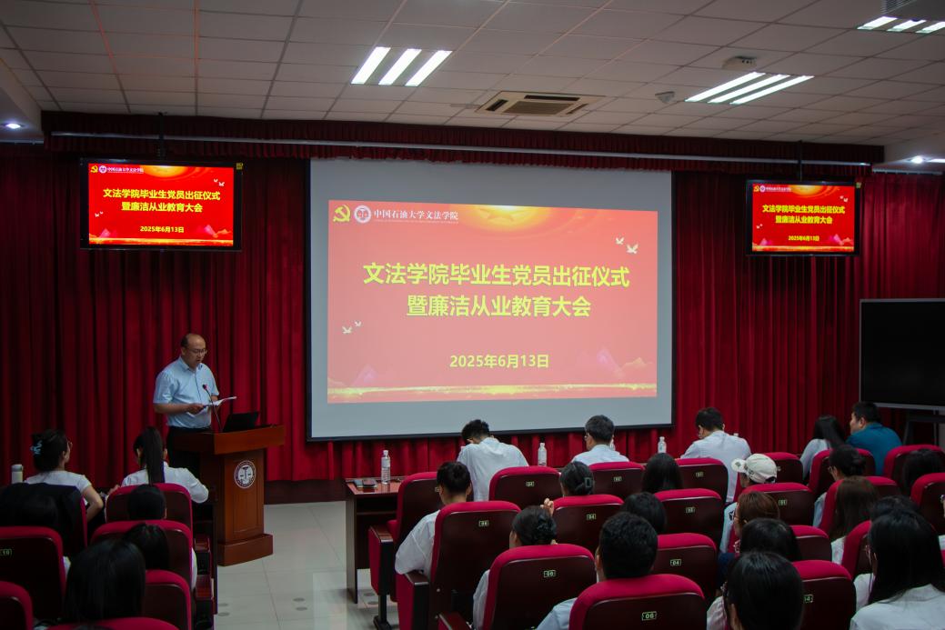 6月13日下午,文法学院2025届毕业生党员出征仪式暨廉洁从业教育大会在文理楼142举行。仪式由学院党委副书记陈熙主持,学院党委书记姚成郡、学校纪委监督检查室主任李健、学院毕业班辅导员及2025届全体毕业生党员参加仪式。